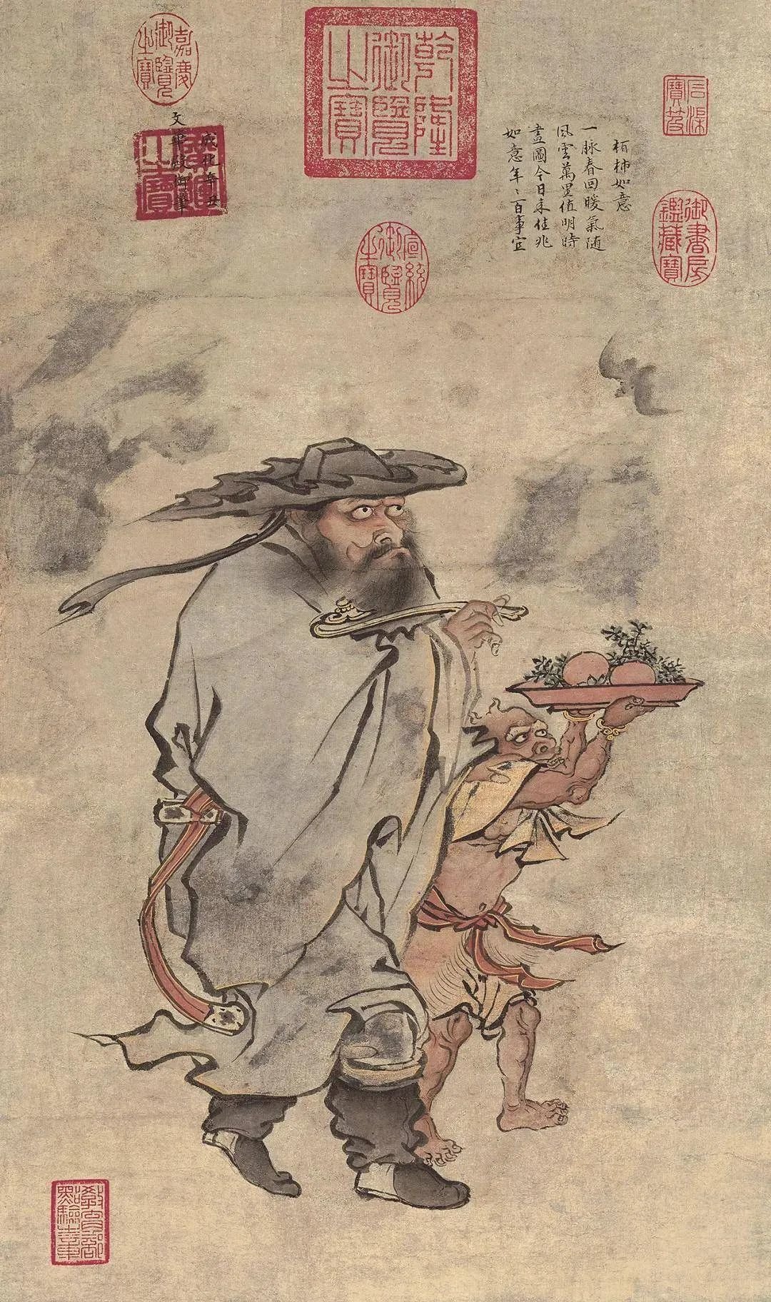 明成化十七年(1481年),著名的恋母皇帝(痴恋年长自己17岁的万贵妃)明宪宗朱见深曾亲手画过一幅岁朝图——《岁朝佳兆图》,由于朱见深擅长人物画。因此他的岁朝图大多描绘宫廷过年欢庆的场面或者与过年有关的人物。《岁朝佳兆图》中就重点刻画了民间传说里门神之一钟馗(还有神荼、郁垒、秦琼、尉迟敬德等)。画中钟馗正用眼睛盯着向他飞过来的蝙蝠,寓意“福(蝠)在眼前”或“福(蝠)来”;手中还拿着一个如意,旁边小鬼手上端着一盆柿子和柏树枝,寓意“百(柏)事(柿)如意”。