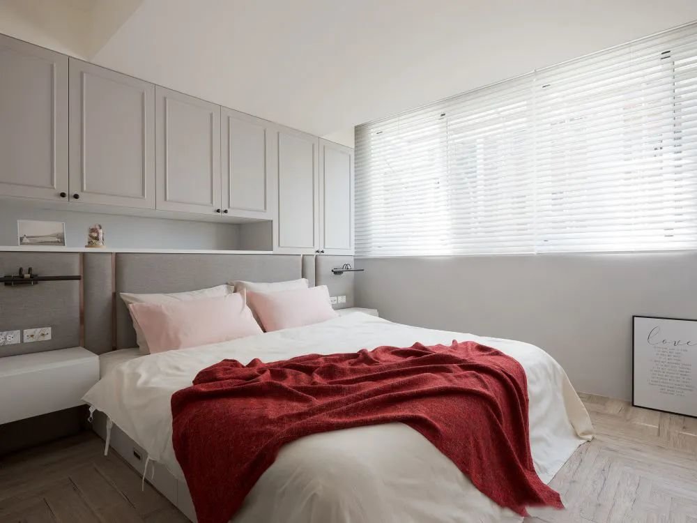 想在乳胶漆的基础上再做些花样,可以在设计时,将床头墙两侧的墙面做相呼应的造型设计,把床头墙融入到硬装里,让整个空间显得更具有设计感。