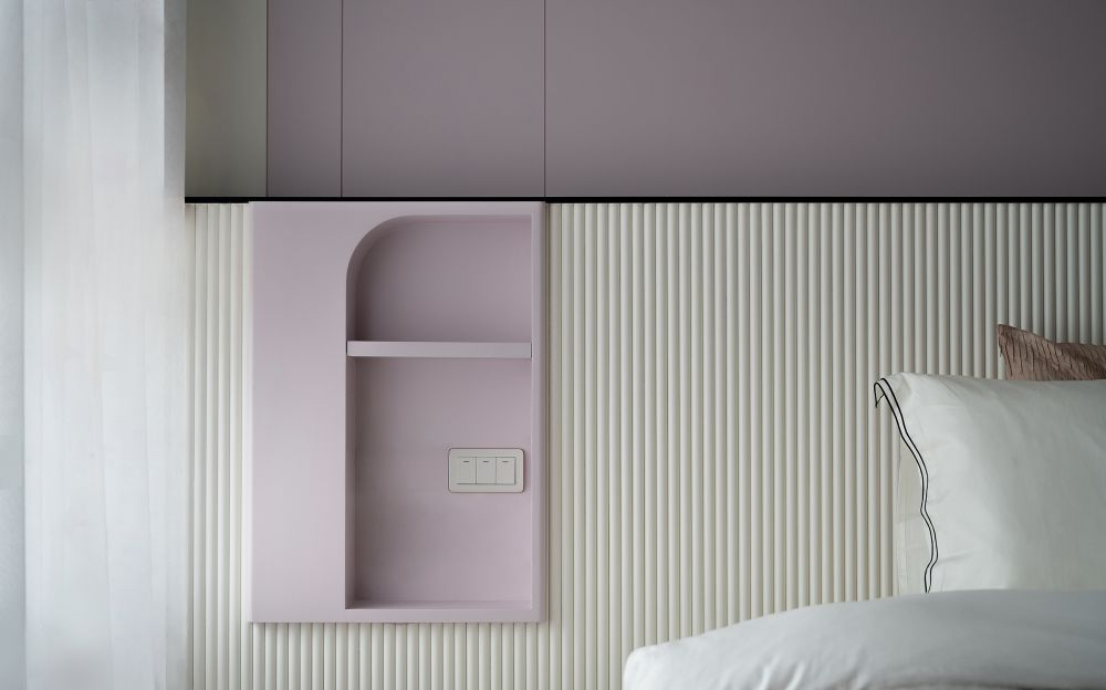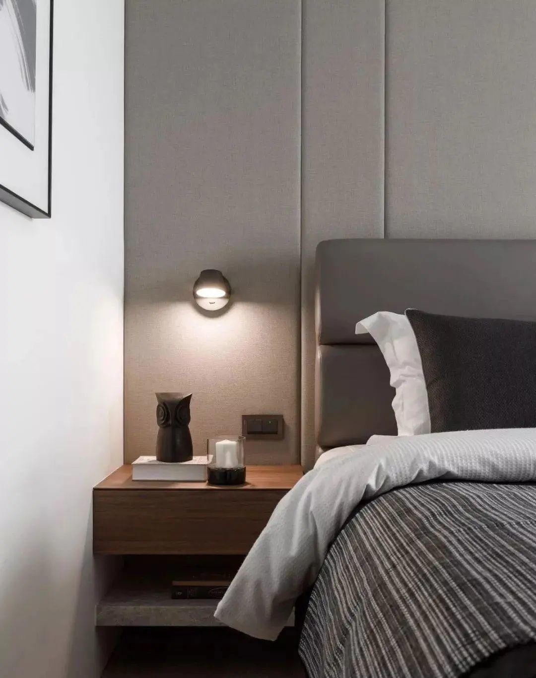 作为一个上班族,最常见的充电习惯,就是在睡前放下手机充电~因此在设计床头墙时,需预留放置手机、眼镜或是手表之类的桌台和插座位,这样不论是睡前充电,还是随手安放物品,都更加方便且符合我们的日常生活习惯。