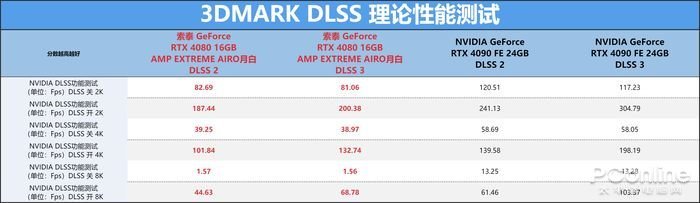 还是老样子,我们先测试一下DLSS 3的理论性能,这里用到的是3DMark最新的DLSS 3 Benchmark,索泰RTX 4080 AMP EXTREME AIRO月白在4K分辨率下,开关DLSS 3前后性能差距足足有3倍之多,你以为这就结束了?在8K分辨率下,DLSS 3恐怖的硬实力能够将原本1.56 FPS的测试画面优化至70 FPS左右,不得不说老黄这次真的没有吹牛,DLSS 3确实有点东西。