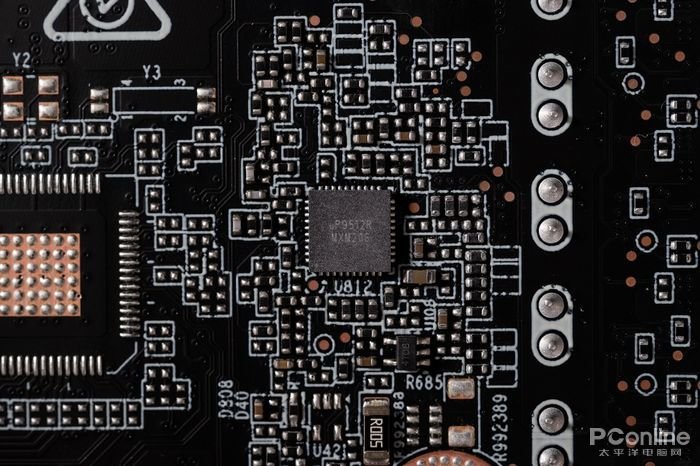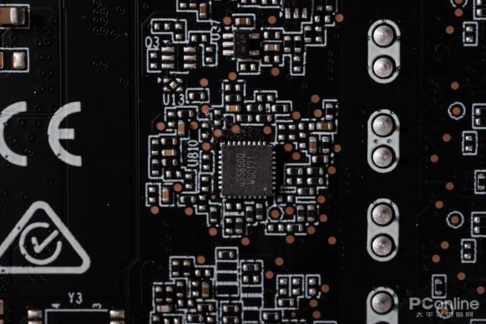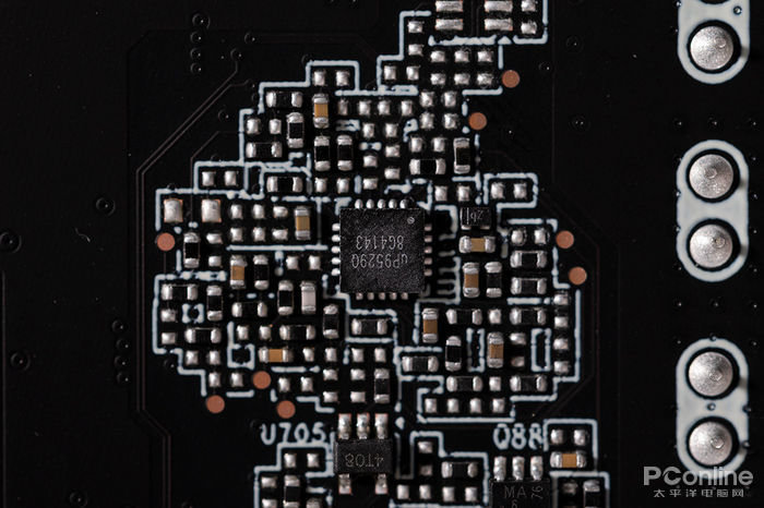 核心供电和显存供电均配有PWM供电控制芯片,安排在PCB背面,型号分别是:uP9512R、uP9529Q以及uS5650Q。其中uP9512R与uP9529Q共同管理核心供电,可以做精细化的供电管理,而uS5650Q则是主要负责显存供电部分。