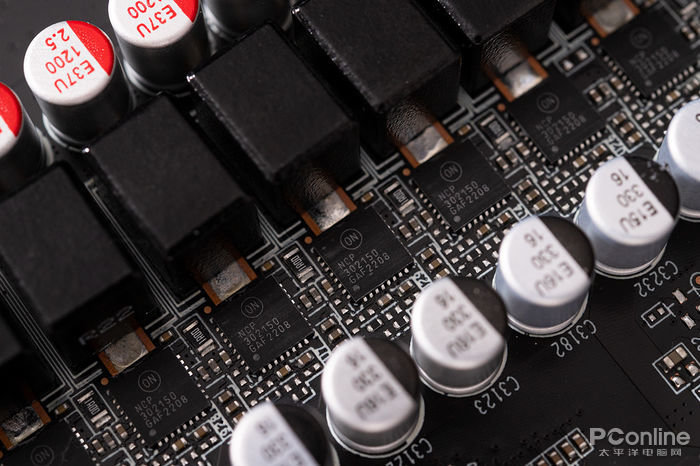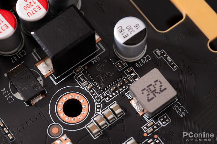 核心供电与显存供电均采用了独立的DrMos芯片,并且配置一致,封装型号为NCP302150,来自安森美科技,持续输出电流为50A。