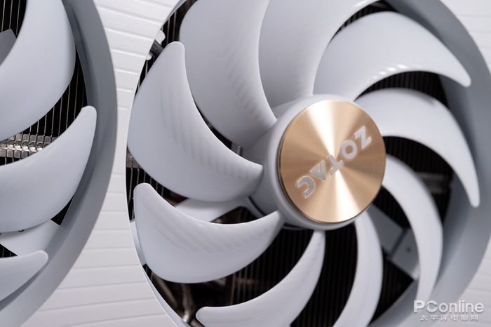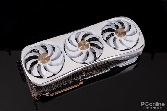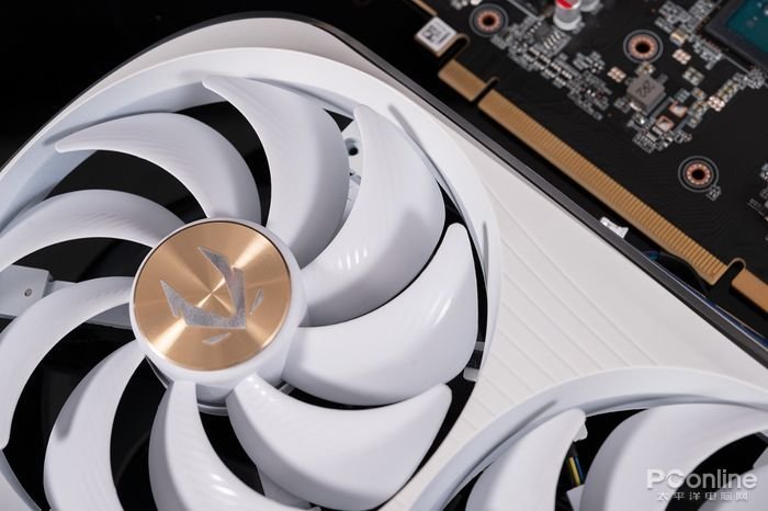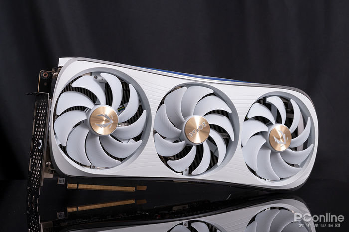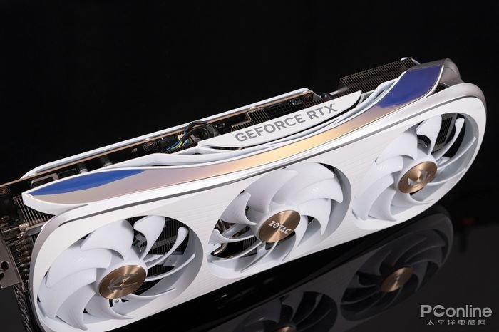 整张显卡以白色为主打色,风扇上的金色与包边的银色为辅,在视觉效果上既时尚又不过分高调,给人一种唯美的小清新感。是笔者见过的所有RTX 4080显卡中独树一帜,可以说是最具特色的一款。