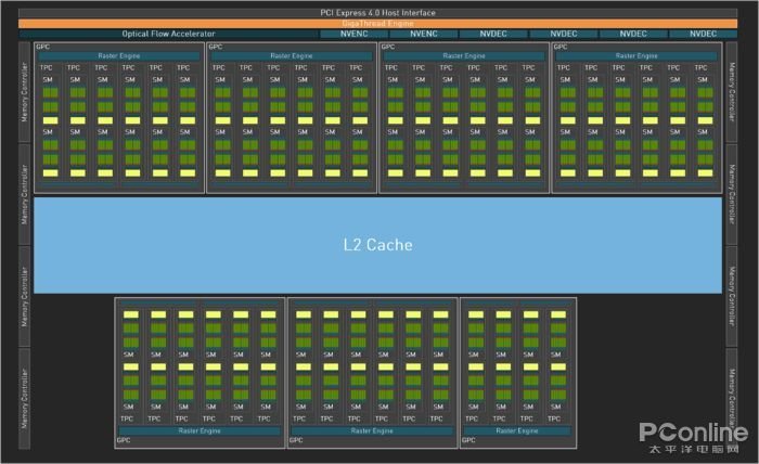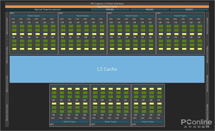 另外缓存方面Ada Lovelace架构也进行了大规格的提升,首先每个SM单元中单独配上了128 KB的缓存,这样RTX 4080显卡中就实现了97MB L1/共享内存。其次核心的二级缓存进行进行了重新的设计,并且完整AD103核心与RTX 4080都是64MB二级缓存,相比RTX 3080 Ti可以说是质的飞跃。