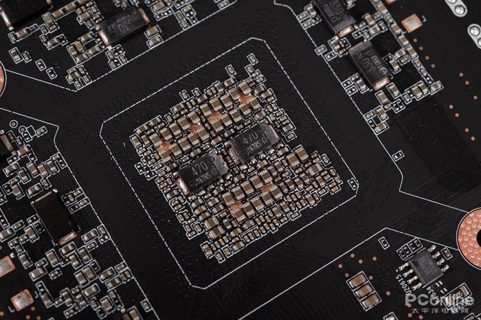 要说这背面最显眼的当属核心后的电容,使用了两个POSCAP(导电聚合物钽电容),电气性能更强一些。