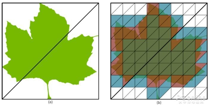 三角形。根据Alpha 通道的不透明,透明与未知等三个不同的块状态进行处理:透明则直接忽略继续找下一个,不透明块则记录并告之命中,而未知的则交给着色器来确定如何处理,这样GPU很大部分都不需要进行着色器的调试处理,能够实现更为高效的性能。