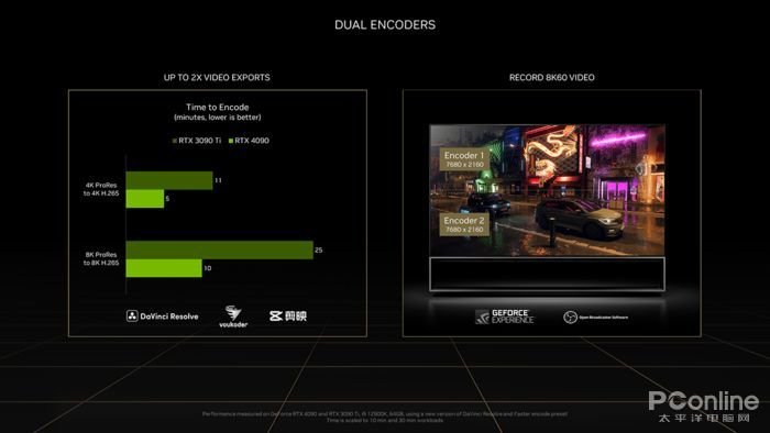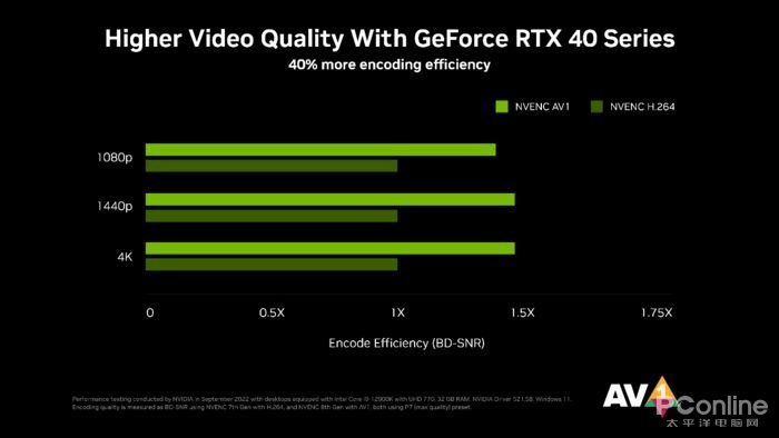 GeForce RTX 40 系列显卡还有一个全新的升级,那就是双编码器NVENC。第八代的NVENC双编码器不仅支持H.264与H.265,还支持开放式视频编码格式 AV1。