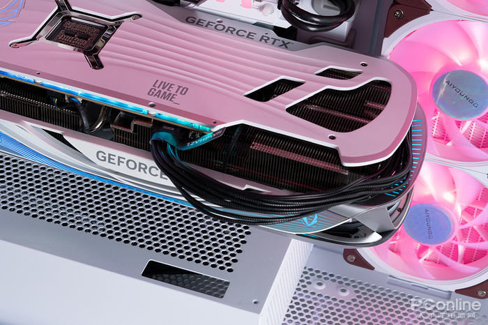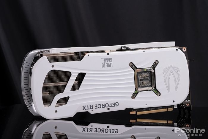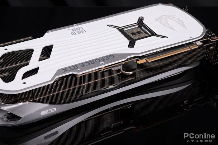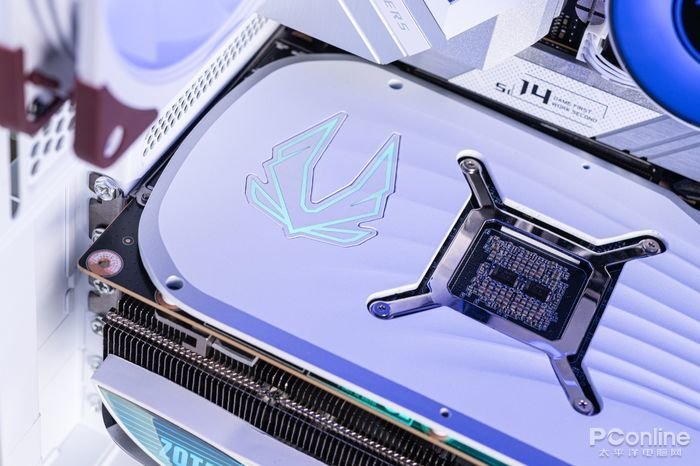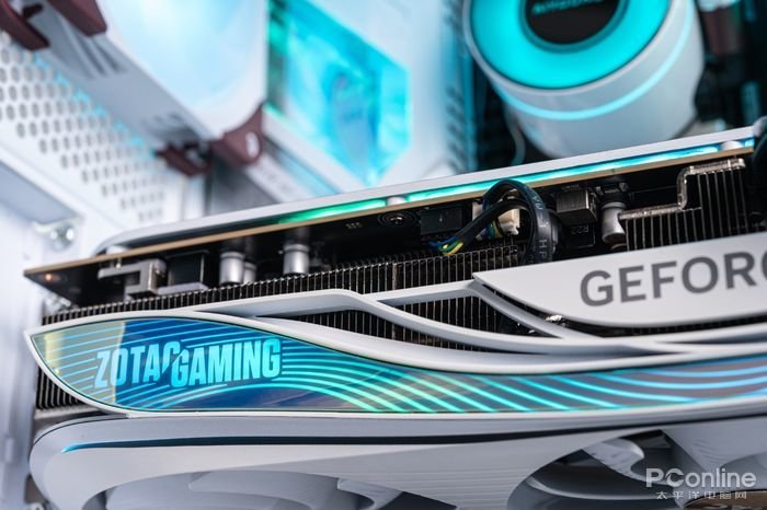 不止显眼的地方有RGB,索泰在这款显卡上藏了不少灯珠,像金属背板之下也有隐秘的灯带,从机箱侧面看去就是绵延不绝的水流在显卡之上舞动。