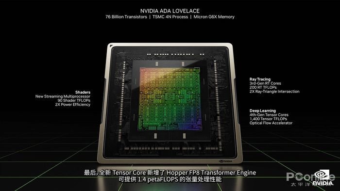以为刚才的CUDA数量与超大L2缓存就已经很猛了,实现上Ada Lovelace架构最大的提升还是在第三代 RT Cores与第四代 Tensor Cores身上。