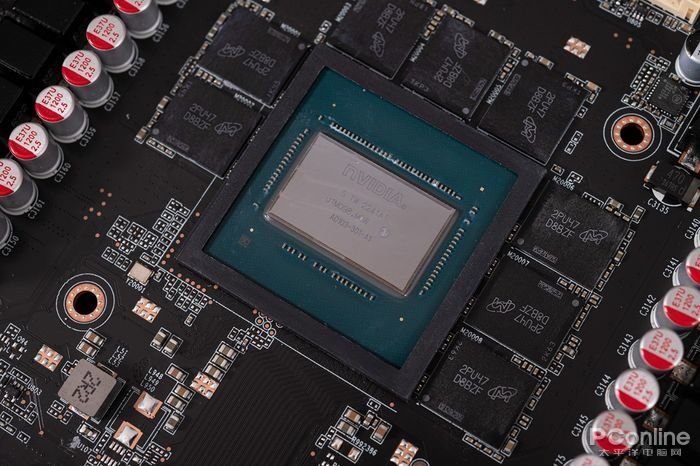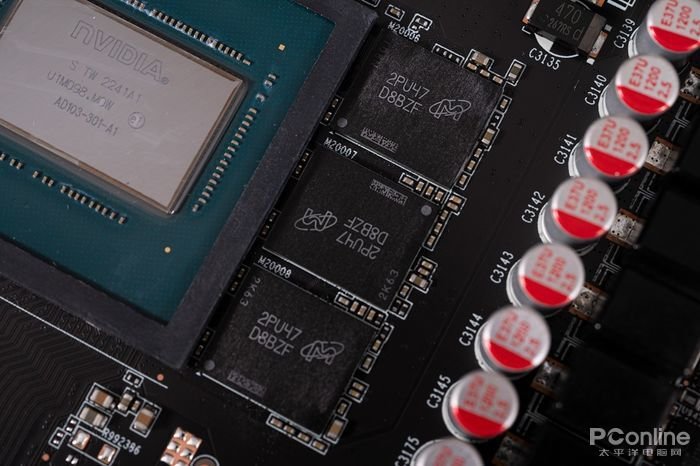 核心的四周是8颗GDDR6X显存,由美光与NVIDIA联合研制,型号为2PU47 D8BZF,单颗显存容量2GB,8颗组成16GB,显存位宽为256Bit,速度达到了22.4Gbps。
