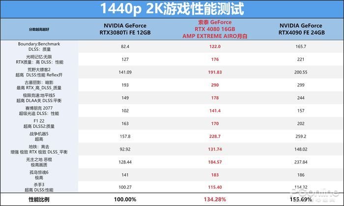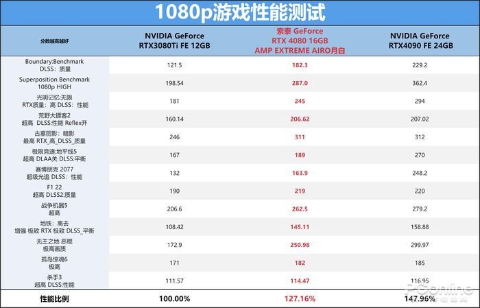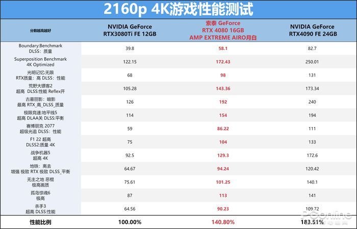 2K分辨率下,索泰RTX 4080 AMP EXTREME AIRO月白开始出手了,在我们测试的近10款游戏中,基本都能够达到144 FPS以上,不少游戏还有200 FPS的惊人表现,并且相比前代RTX 3080 Ti也是展现了高端显卡的真正实力,性能领先足足有35%。