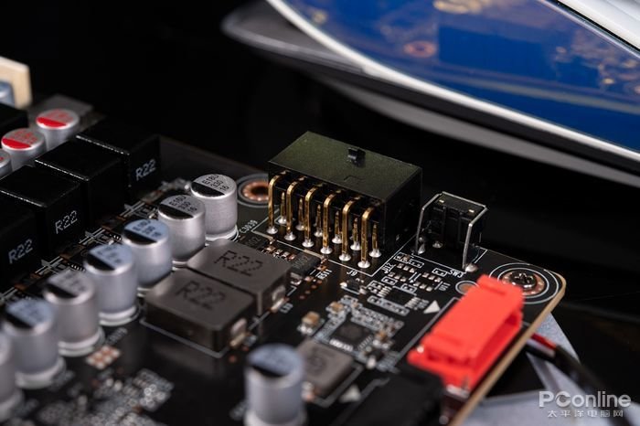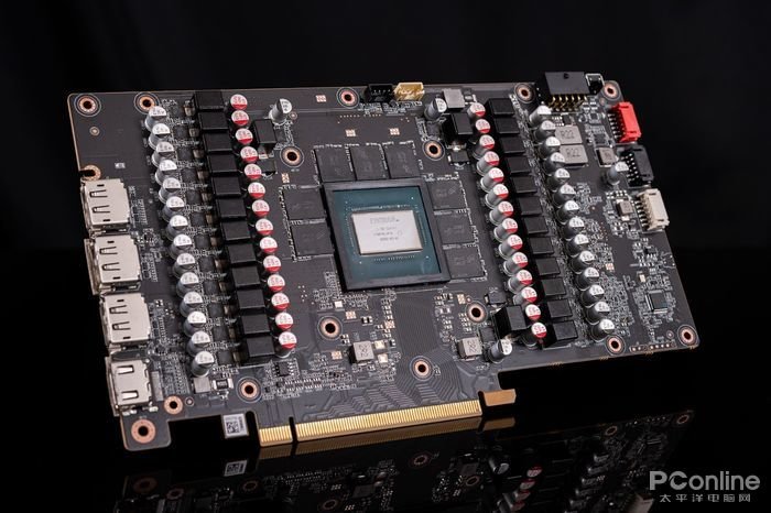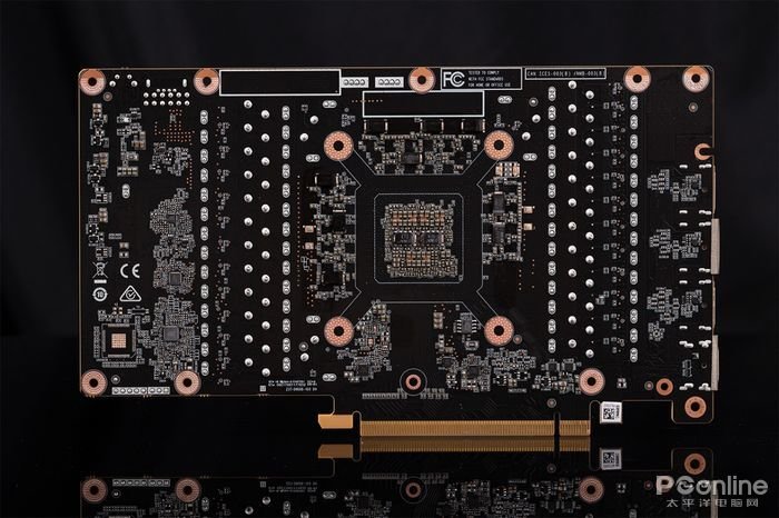 在金属背板的一侧还有镂空窗口设计,配合散热器上第三组风扇的风流能够直接穿透散热鳍片以及镂空的PCB,显著降低显卡温度。