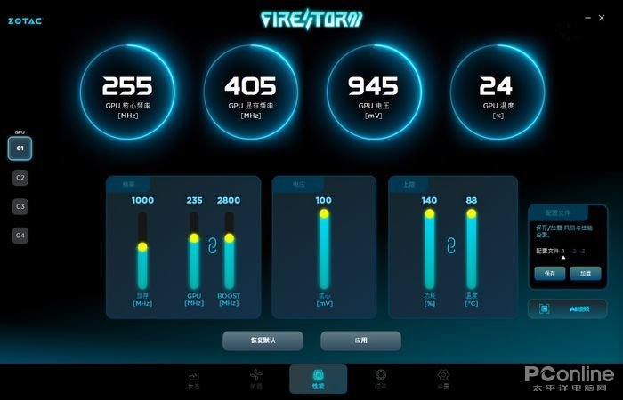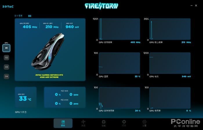 超频已经是高端显卡的基本操作了,索泰RTX 4080 AMP EXTREME AIRO月白这么高规格的散热加之旗舰级的性能自然不能放过这个绝佳的超频机会,这里我们将使用索泰的FireStorm控制中心对显卡进行超频,这款软件不仅能够用于超频,还能轻松控制显卡BIOS、灯效调节、查看显卡状态等。