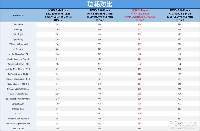 为了更直观的展示索泰RTX 4080 AMP EXTREME AIRO月白的功耗表现,我们利用HWINFO64软件与FrameView软件双重记录多款显卡的功耗表现情况,从图中可以看到这款显卡整体功耗控制相当出色,在所有测试场景内都不到400W,几乎所有项目的功耗都比RTX 3080 Ti还要低,但性能却远远超越前代卡皇RTX 3090 Ti。