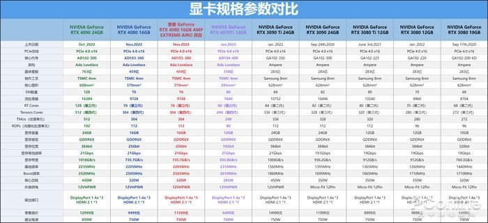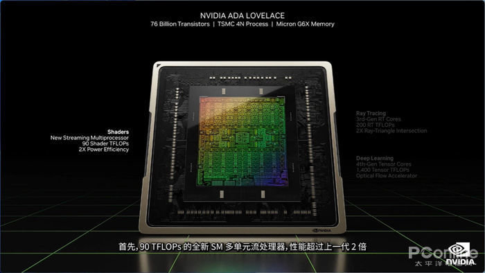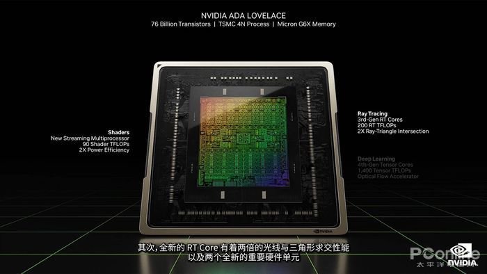 从Turing架构开始,NVIDIA首次在显卡中加入了加速光线追踪的RT Core单元,以及面向AI推理的Tensor Core单元,这革命性的创新使实时光线追踪成为可能。而Ampere架构则是全面的架构改进,在加入新一代的二代RT Core和三代Tensor Core基础上,还有着更先进的SM单元设计,这样显卡工作效率那是翻倍的提升。而来到Ada Lovelace架构,同时是以效率提升为大前提,自然是引入了最新的第三代 RT Cores与第四代 Tensor Cores单元,同时加入众多新颖的黑科技,从执行效率来说Ada Lovelace架构是上代Ampere架构的2倍以上,甚至光线追踪能力更是达到了恐怖的4倍性能。