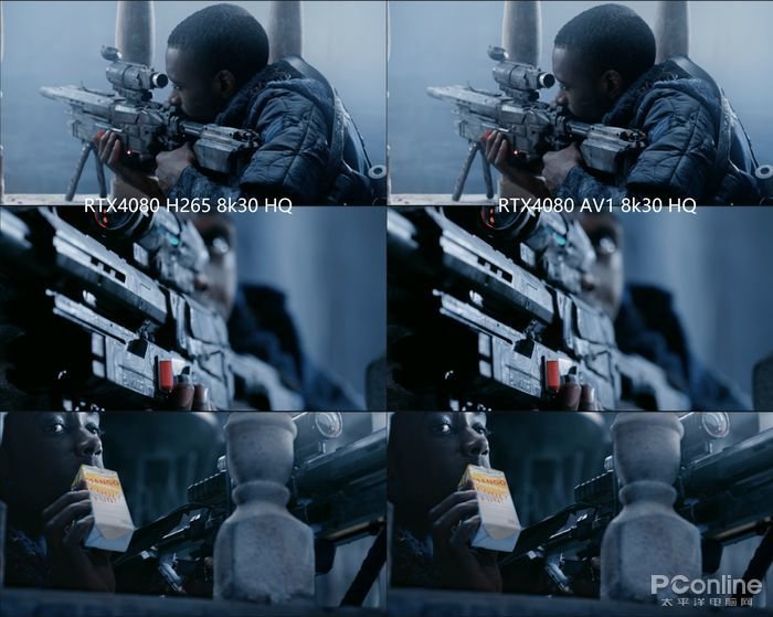 有不少用户担心,那编码速度快又占用小,那会不会降画质。这里我们截取了几个画面进行对比,从肉眼来看,其实画质几乎完全一样,这样也意味着AV1可以用更小的空间占用量实现与H.265同等规格的画质表现。