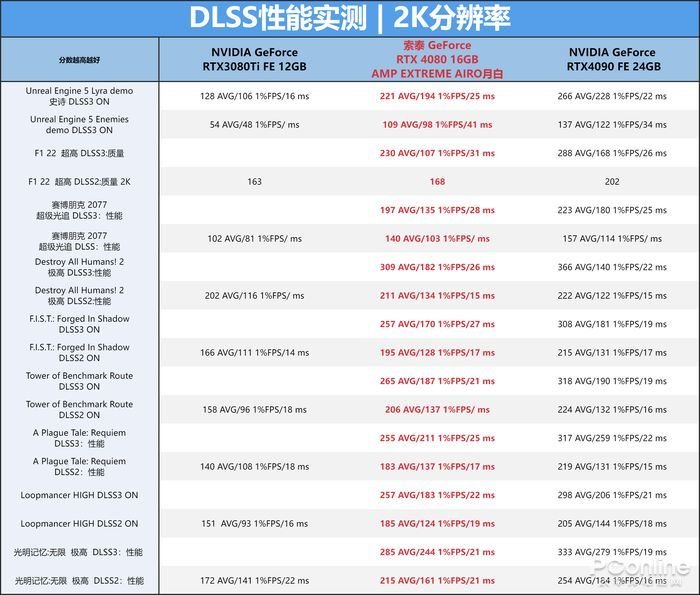 单一款游戏可能不能说明代表性,因此我们也测试了更多游戏,索泰RTX 4080 AMP EXTREME AIRO月白在2K画质下,开启DLSS 2已经超越前代RTX 3080 Ti不少了,一旦开启DLSS 3,它将进化成性能猛兽,大幅领先前者,实测不少游戏在DLSS 3已经能够满足240Hz的高刷游戏需求了。