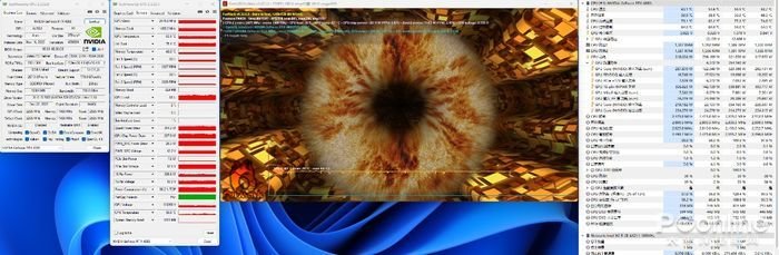 同时显存、电感、Mos管处还有高系数的导热垫填充硬件与均热板间的空隙,有助于高效导热。GPU核心也是抹上了厚厚的一层硅脂,毕竟压制的可是次旗舰定位的AD103核心。