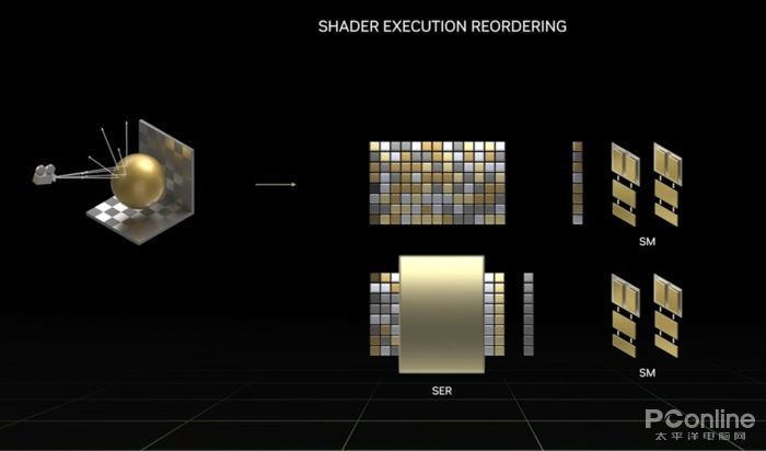 同时Ada Lovelace架构SM中新增了着色器执行重排序(Shader Execution Reordering,SER),这是由于光线追踪不再只有强光或者阴影渲染处理,未来将会更多的是在光线的运动性,这样光线就会变得越来越复杂,想要第三代 RT Cores与第四代 Tensor Cores有着更高的执行效率,那就得为他们来安排一位管家。而着色器执行重排序(SER)就是为了能够即时重新安排着色器负载来提高执行效率,为光线追踪提供2倍的加速,也能更好地利用 GPU 资源。不过目前仍未有实例,想实现这个功能,还得游戏与开发工具的支持才行。