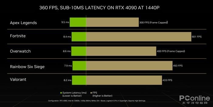 当GeForce RTX 40 系列显卡和 NVIDIA Reflex搭配上后,直接达到1440p分辨率360 FPS的体验,这着实是性能有点强劲了。