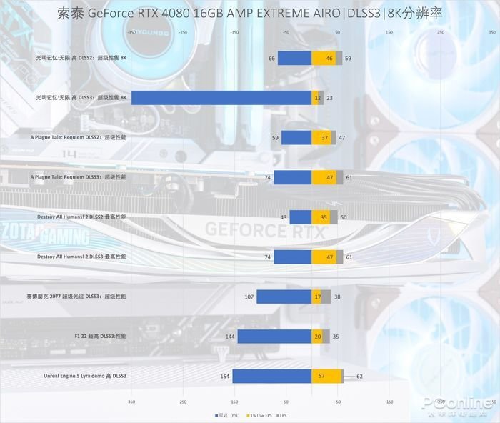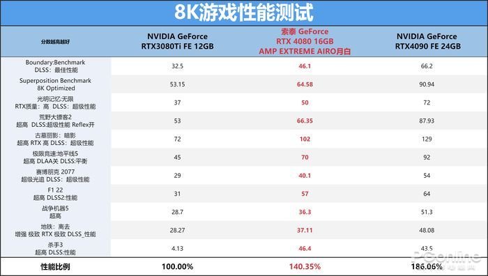 8K分辨率的测试我们也做了,测完后不得不说,16GB的显存卡得刚刚好,在8K游戏下,这张显卡已经到极限了,可见16GB显存应对8K游戏还是有些不足,不过索泰RTX 4080 AMP EXTREME AIRO月白在部分游戏中依旧能够稳定60 FPS运行,像是《瘟疫传说:安魂曲》这类新游戏,开启DLSS 3后还是不错的,其他游戏则需要等游戏厂商优化,届时配上8K的显示器甚至是电视,全新的游戏体验一定能够惊艳众人。