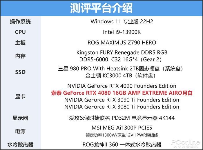 看完拆解,下面介绍一下这次的测试平台,为了测试这张索泰RTX 4080 AMP EXTREME AIRO月白,我们搬出了评测室的最强硬件。