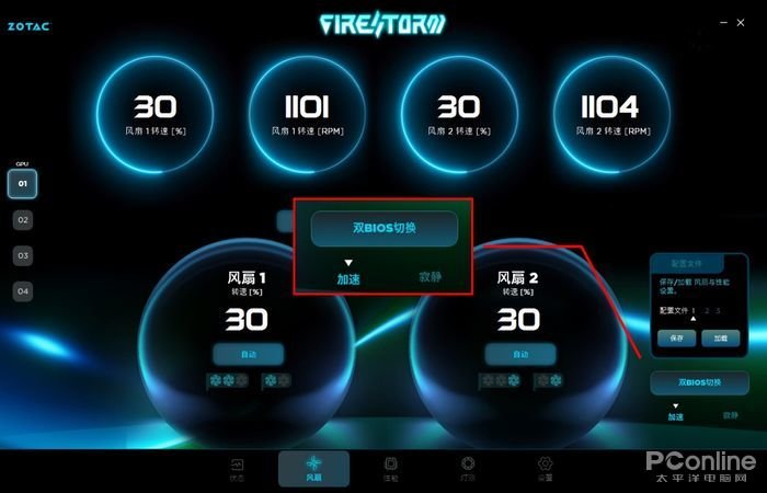 在电源接口旁边还有个小按钮,这就是索泰RTX 4080 AMP EXTREME AIRO月白的BIOS切换按键,点击即可在双BIOS中来回切换。另外在索泰的FireStorm控制中心也可以直接切换,更加方便快捷。