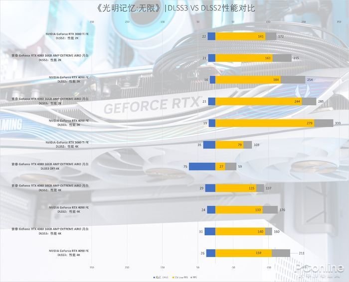 DLSS 3在理论测试中的表现属实惊为天人,那它在游戏中的表现又如何呢?这里我们选择了《光明记忆:无限》这款游戏进行对比实测。
