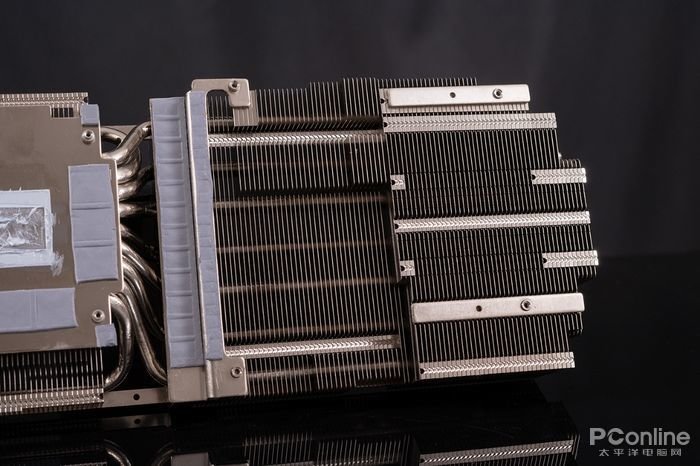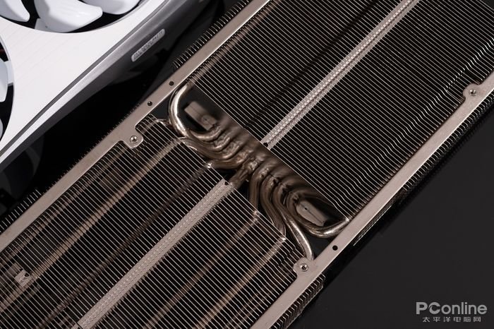 散热鳍片之下是9热管豪华阵列,并且全部换装升级为冰脉2.0版本,新版本采用精密的无损内嵌焊接工艺,将9根热管均匀分置贯穿整个模组。