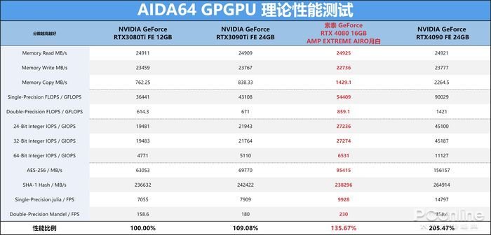要说提升更大的还要属算力部分,在AIDA64 GPGPU理论性能测试中,索泰RTX 4080 AMP EXTREME AIRO月白的表现算得上是压倒性的胜利,整体性能领先RTX 3080 Ti 40%以上,无论是在单精度还是双精度浮点运算上,这款显卡都有强劲的表现,相较于30系显卡来说,这次的索泰RTX 4080 AMP EXTREME AIRO月白就是一次全方位的升级。