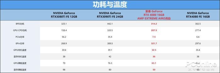 在拆解中我们了解到索泰RTX 4080 AMP EXTREME AIRO月白采用了创新的气流优化设计,并且散热系统也经过全面迭代优化,因此笔者对它的功耗与发热表现寄予厚望。