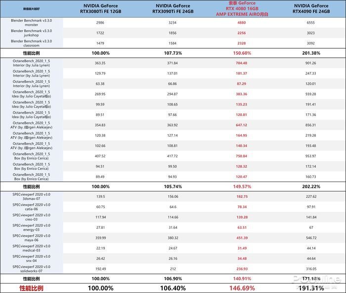 测完给我的感觉就是RTX 40系显卡完全就是冲着专业生产力领域来的,单是在Blender渲染软件中,索泰RTX 4080 AMP EXTREME AIRO月白相比前代RTX 3080 Ti就有50%以上的提升,面对RTX 3090 Ti也丝毫不虚,性能依旧45%的领先幅度。而另一款OctaneBench中表现也是如此,完完全全吊打30系显卡。
