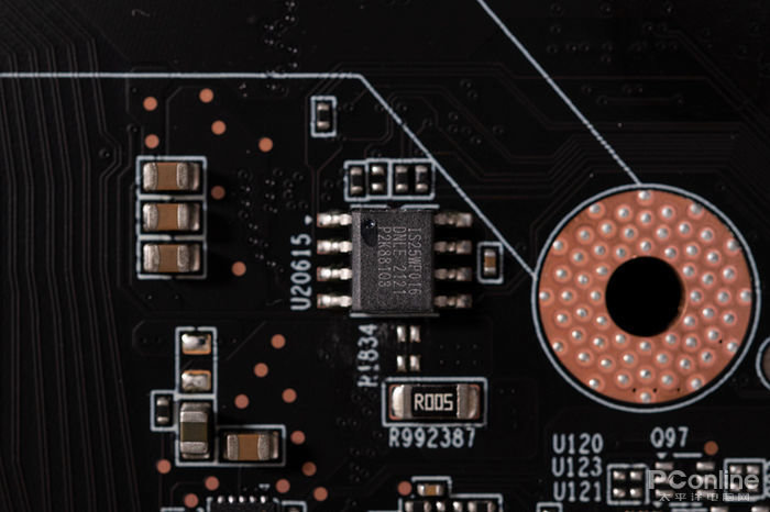 在PCB上还能发现两颗不起眼的小芯片,这是索泰RTX 4080 AMP EXTREME AIRO月白的BIOS控制芯片,型号为IS25WP016,分别控制加速与寂静两种不同的BIOS。