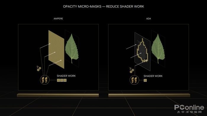 所以在第三代 RT Cores增加了两个重要硬件单元:Opacity Micromap Engine与Displaced Micro-Meshes Engine引擎。Opacity Micromap Engine,主要是用于alpha通道的加速,可以将 alpha 测试几何体的光线追踪速度提高2倍。