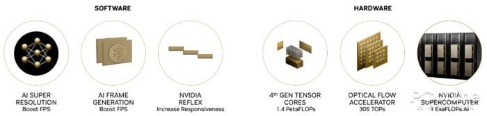 上面游戏性能测试里一直提到的DLSS 3是本次RTX 40系显卡的重要升级点之一,用过20系及以上显卡的用户应该不算陌生,这是一个能够在不影响画面质量的情况下提升游戏性能的黑科技,现在DLSS进行迭代,在新显卡上更新至3.0版本,新增帧生成和NVIDIA Reflex技术,据老黄说它实现游戏性能的翻倍提升。