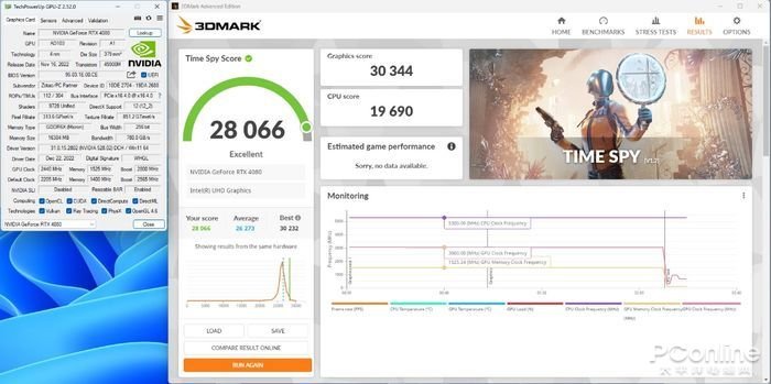 理论性能能够让我们先对这款显卡的性能有一个大致的了解,因此这里采用3DMark对索泰RTX 4080 AMP EXTREME AIRO月白进行一个基本测试,同时加入了上代卡皇RTX 3090 Ti,从而能够更直观的了解到这代显卡的性能提升。