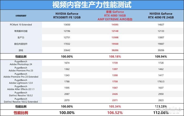 首先是PCMark 10 Extended测试,索泰RTX 4080 AMP EXTREME AIRO月白的优势主要在数位内容创作与游戏两个子项目上,通过上面的游戏实测,这一点已经得到了有力的证明。而在PugetBench的Adobe软件测试中,由于Adobe软件本身对显卡要求不高,因此差距不明显,不过索泰RTX 4080 AMP EXTREME AIRO月白还是有特殊优势的,16GB的超大显存能够让它处理更复杂的项目,而RTX 3080 Ti常常会有捉襟见肘的情况出现。