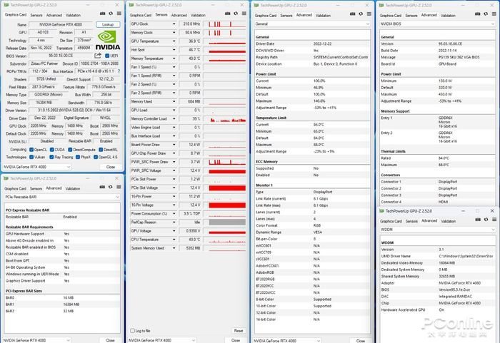 另外在GPU-Z中我们还可以看到索泰RTX 4080 AMP EXTREME AIRO月白的温度限制跟功耗墙,这款显卡的TGP最终落在320W,与公版一致,最高允许突破至450W;88℃的温度墙显然是为了超频所预留的冗余空间。