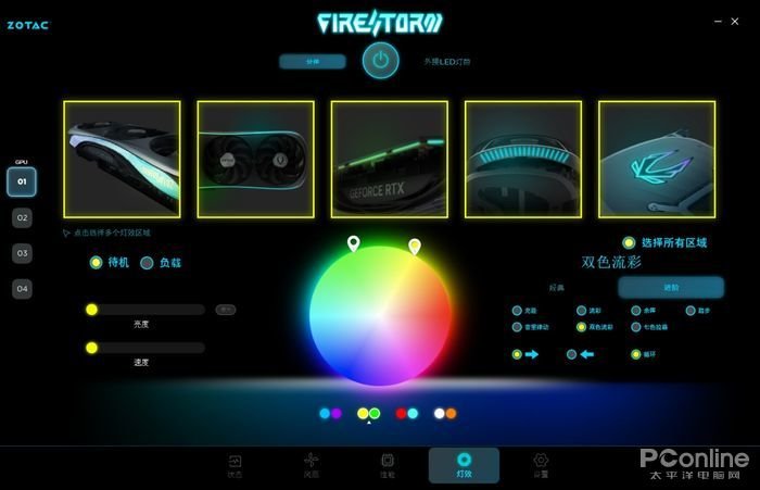 玩家还可通过索泰的FireStorm控制软件自行设定不同的灯效模式和颜色,或一键同步5个区域的灯效。