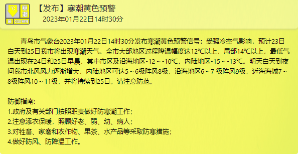 受强冷空气影响,预计23日白天到25日我市将出现寒潮天气。全市大部地区过程降温幅度达12℃以上,局部14℃以上,最低气温出现在24日和25日早晨,其中市区及沿海地区-12~-10℃,内陆地区-15~-13℃。明天白天到夜间我市北风风力逐渐增大,内陆地区可达5~6级阵风8级,沿海地区6~7 级阵风9级,近海海域7~8级阵风10~11级,并将持续到25日。请注意防范。