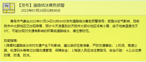 受强冷空气影响,目前青岛市中北部地区已出现降雪,预计今天凌晨到白天,青岛市大部分地区将有小雪,由于地表温度低于0℃,可能出现对交通有影响的积雪或道路结冰,请注意防范。