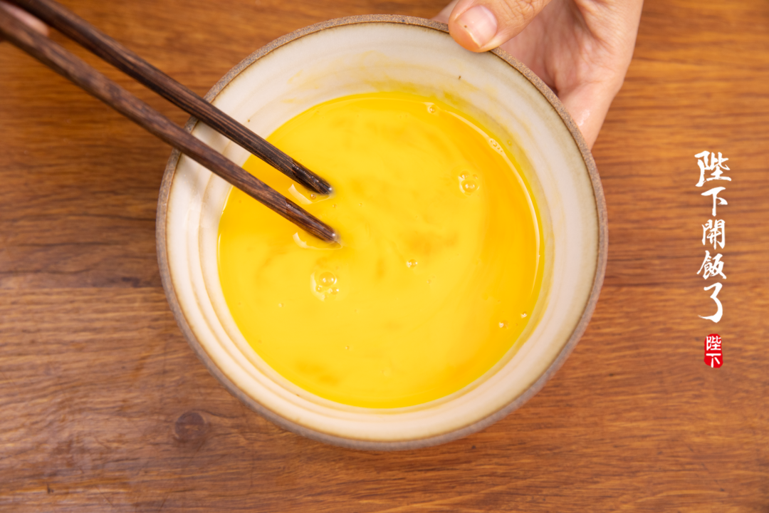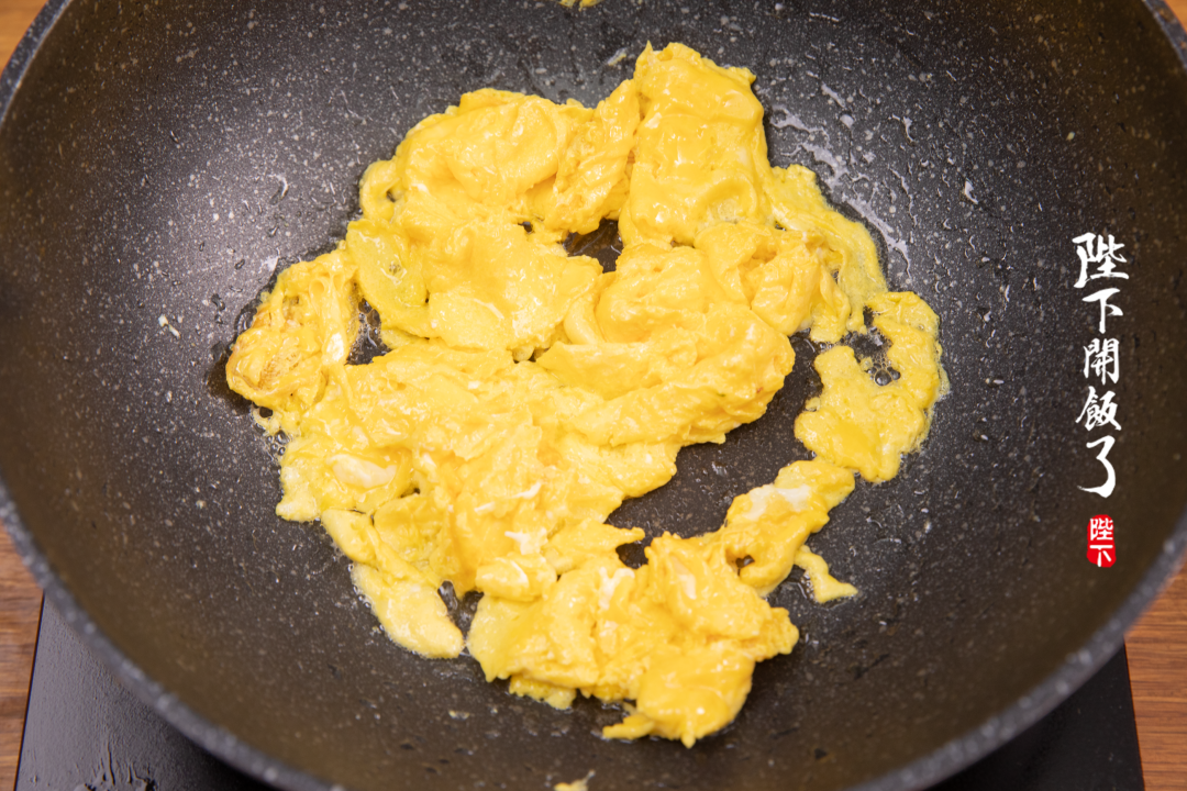 碗里打两个鸡蛋,先下锅炒熟盛出。