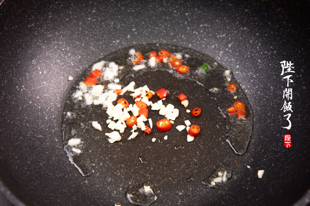 另起一锅,锅内倒入少许油,下蒜末和小米椒。