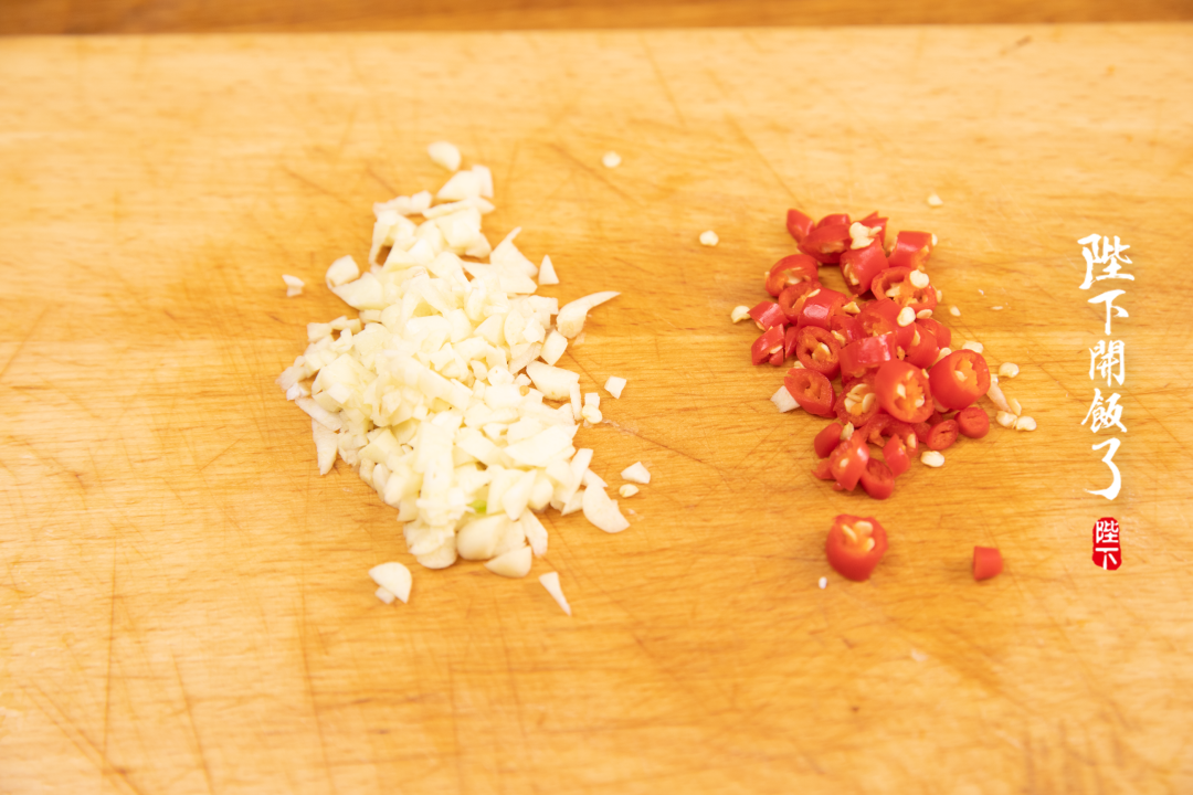 韭菜洗净切段,小米椒、蒜瓣切末。