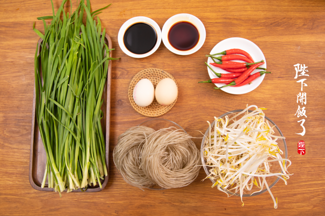 韭菜、鸡蛋、豆芽、红薯粉、小米椒、生抽、老抽