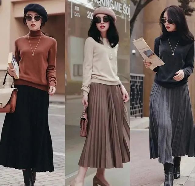 除了百褶裙,伞裙和直筒裙和针织毛衣的搭配也是很多成熟女性最爱的搭配。一件温柔的杏色毛衣和偏军绿色调的直筒裙,让整个身形更加的纤瘦,但是小编在这里温馨提示一下,对于梨形身材的小仙女们就不要选择直筒裙哦,不然很容易暴露身材的缺点,可以选择能够完美遮肉的伞裙哦,对于胯宽还有大象腿的小仙女们很友好哦!