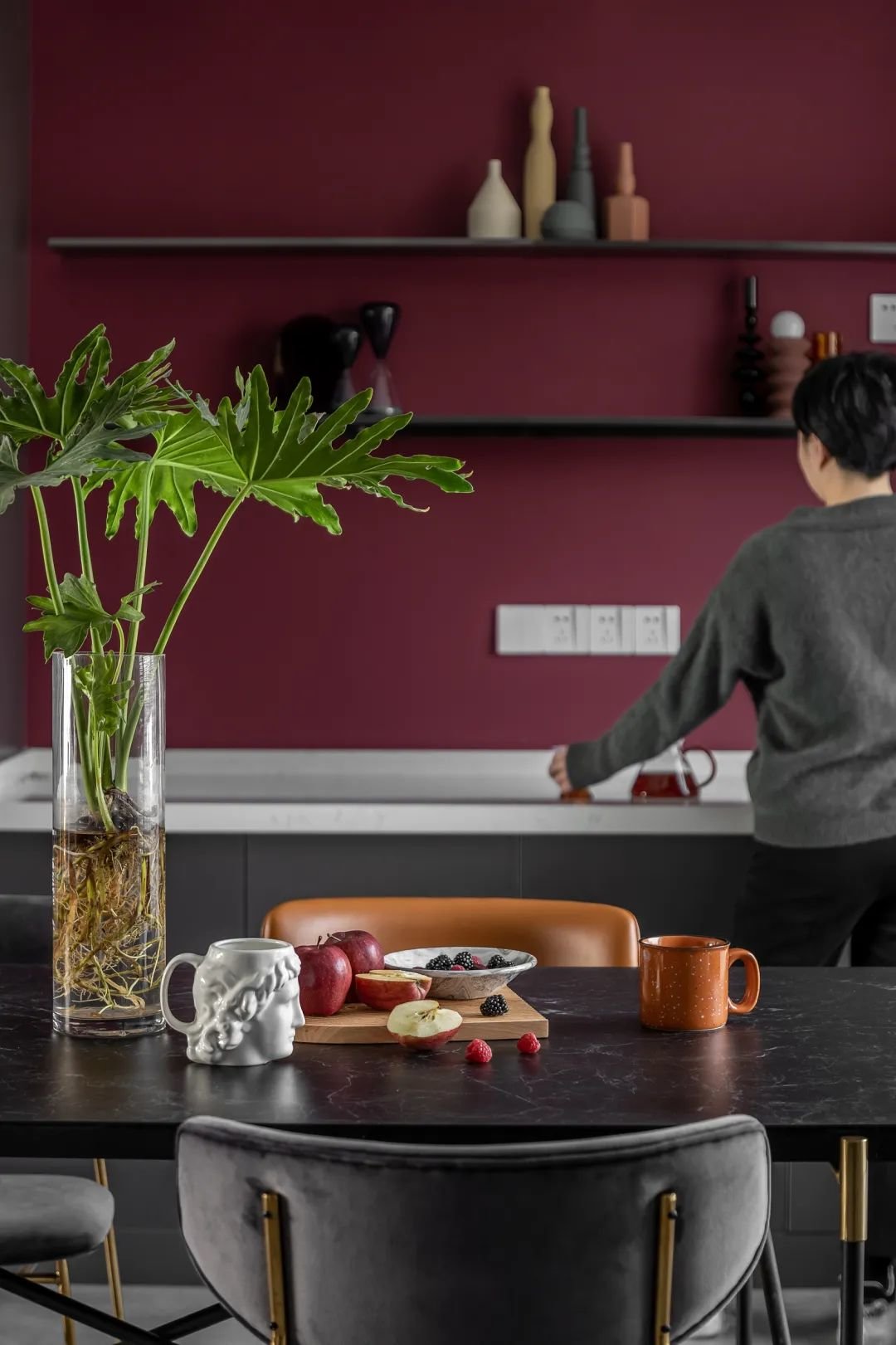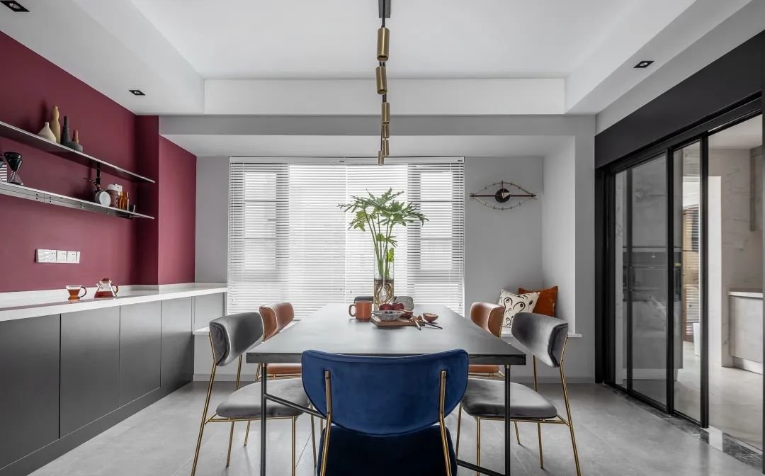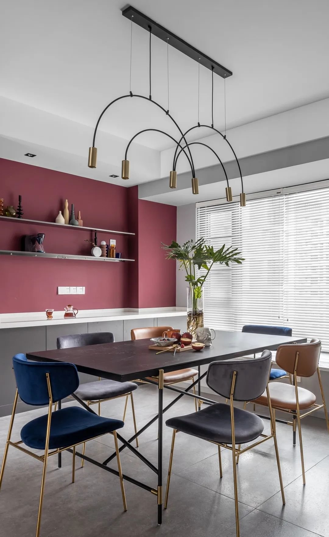 ▲餐厅摆上轻奢格调的餐桌椅,灰色、蓝色与粉色的餐椅组合,侧边定制一排黑色的餐边柜+吊柜组合,上方墙面是红色的乳胶漆,使得用餐环境格外的优雅高级。