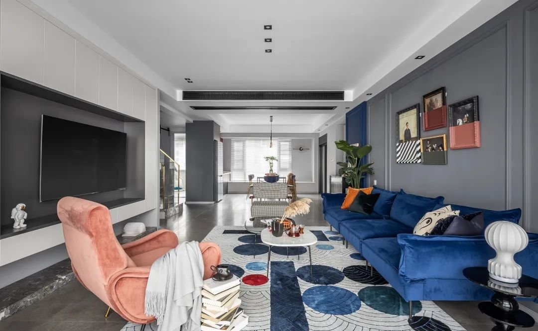 这是一套160平米的复式房屋,整体以现代轻奢风格的混搭设计,大胆的配色加入艳丽的风格,打造了一个高级优雅的空间效果。