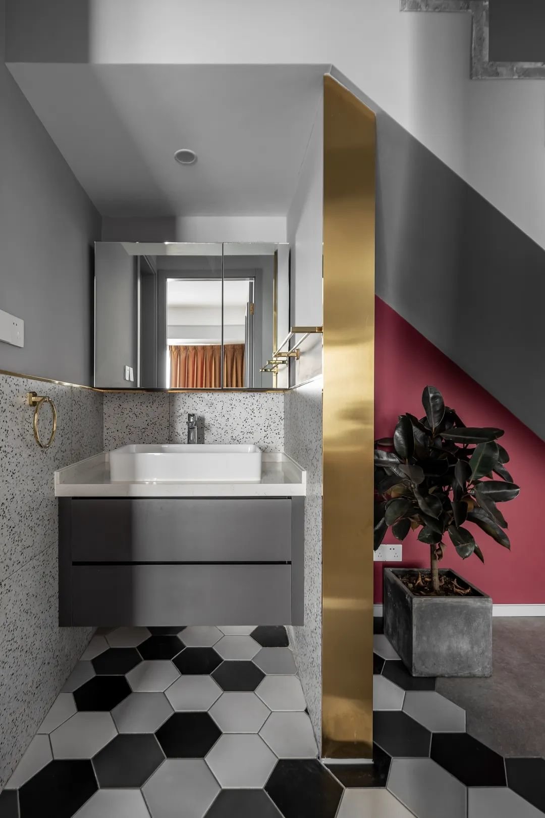 ▲卫生间洗手盆外置,设置在楼梯下方,黑白灰的六边地砖+水磨石墙面砖,旁边楼梯角落还有一盆橡胶皮绿植,布置出一个文艺精致的卫浴角落。