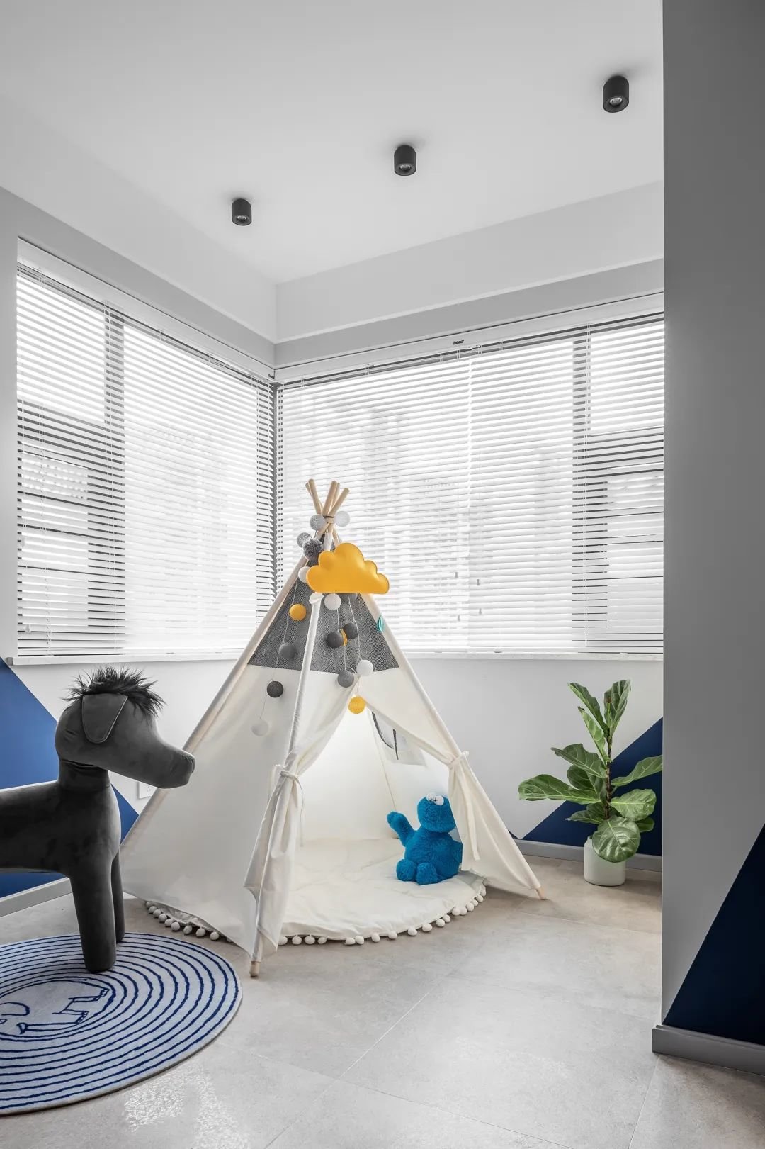 ▲儿童房窗户是百叶帘设计,布置小帐篷、小地毯与布艺木马,还有绿植的装饰,为孩子布置了一个童趣舒适的休闲角落。